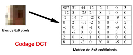 La transformée DCT (Direct Cosine Transform) est un cas particulier de la transformée de Fourier, qui dans certaines conditions, décompose le signal en une série de fonctions uniquement cosinus et en phase avec le signal d'origine, ce qui réduit de moitié le nombre des coefficients nécessaires. Dans le cas des images, on utilise une DCT bidirectionnelle qui transformera un bloc de NxN pixels (de luminance ou de chrominance) en un autre bloc de NxN coefficients correspondant à l'amplitudes des fonctions harmoniques dans l'espace transformé